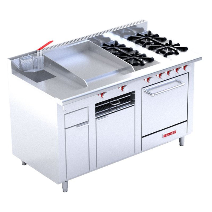 Estufa Múltiple a Gas, 4 Quemadores, Plancha, Gratinador, Freidora, Horno Mediano Coriat MULTICHEF MASTER DE PISO