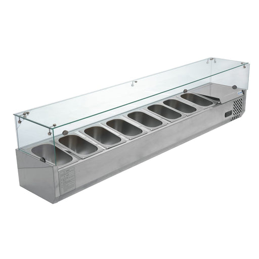 Gabinete fabricado en acero inoxidable. Tapa de cristal abatible con descanso. Insertos sextos de 10 cms. Equipo de refrigeración autocontenido...