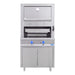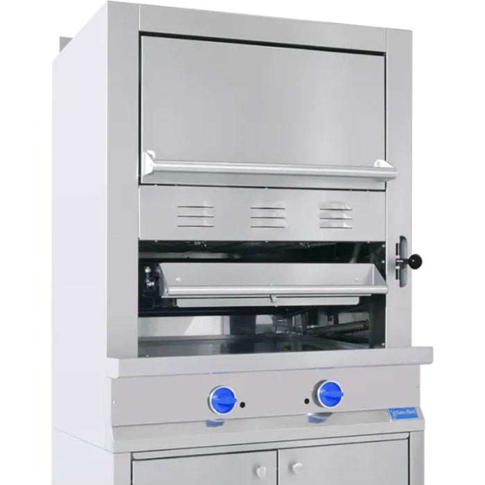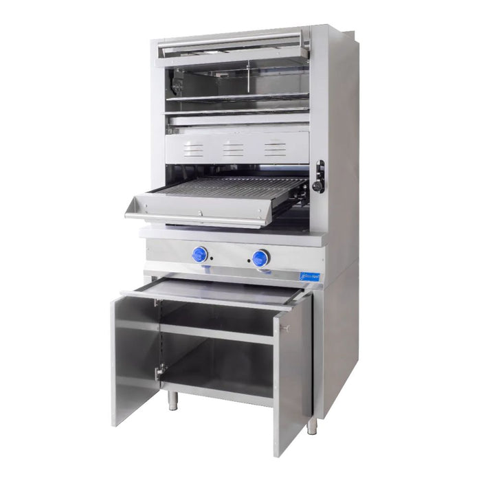 - Quemadores infrarrojos formados por 5 tabiques refractarios de cerámica importada, con soporte de temperaturas de hasta 2000 °C, grado alimenticio con un total de 90,000 BTU/HR de los cuales 80% es aire de ambiente y 20% gas; gracias a este efecto, los quemadores resultan en bajo consumo de energía y alto desempeño de calor. En la parte superior se encuentra un horno estático sin quemadores adicionales y que aprovecha la misma fuente de calor antes de salir por la chimenea. Se puede utilizar para terminar el cocimiento de los cortes y para colocar alimentos (papas y otras verduras), para cocinarlos o mantenerlos calientes. En la parte inferior cuenta con gabinete de acero inoxidable y patas regulables.